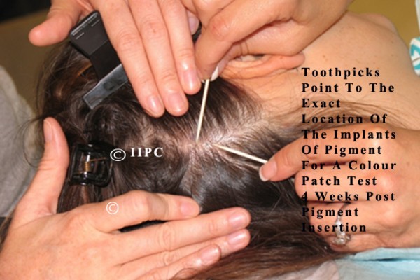How We Perform a Color Patch Test for Permanent Makeup © BY: Susan Church Director of Education at IIPC www.permanentmakeupproducts.com General Guidelines to Check For Sensitivity to Pigments 1. We mix the same pigment colour(s) that we will be using on the client for their requested procedure. Implant colours separately for accuracy. 2. In an inconspicuous area on the client’s scalp, we cleanse the area with alcohol, a sterile Lip Wipe, Green Soap or other appropriate disinfectant. 3. We take a photo of the scalp prior to inserting any pigment. 4. Using a 3 or 5 prong sterile needle, we make 6-7 implants into the clients scalp...